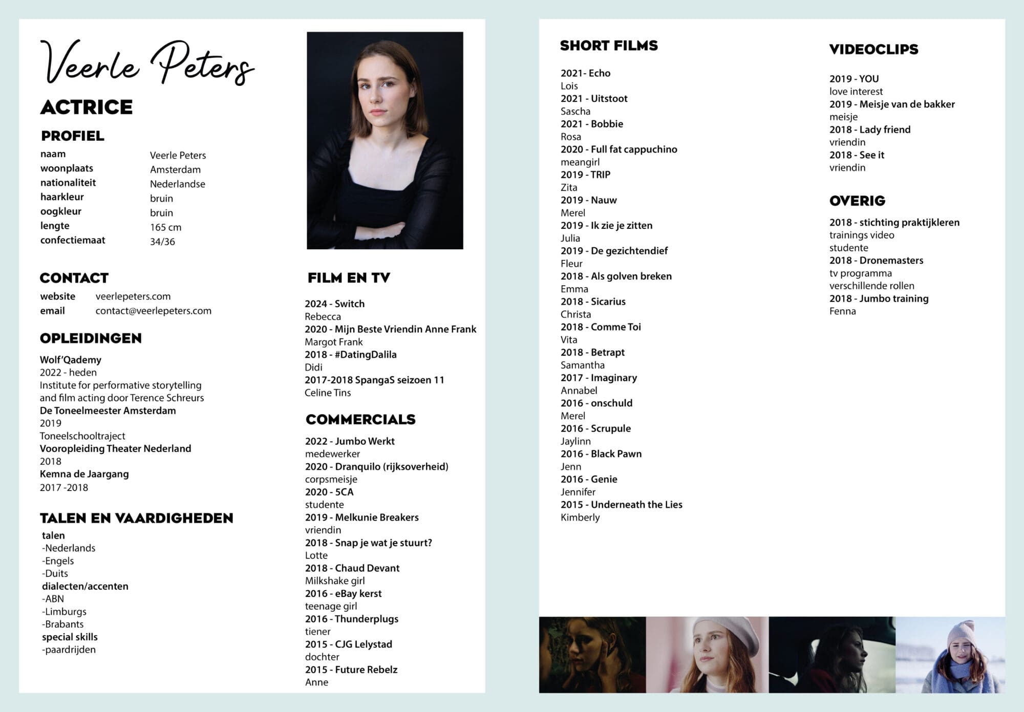 Veerle begon met acteren in 2015. Ze speelde haar eerste rollen in korte films en studentenproducties. Haar tv debuut maakte ze in 2017 in de jeugdserie Spangas, waar ze de rol van Celine Tins 55 aflevering lang vertolkte. In 2020 was ze te zien als Margot Frank in de speelfilm ‘Mijn Beste vriendin Anne Frank’. In 2024 vertolkt ze een hoofdrol in de NPO Zapp serie ‘Switch’. Veerle ontwikkelt en verbreedt haar skills als actrice constant. Momenteel volgt ze de acteursopleiding van Terence Schreurs: Wolf’Qademy.
